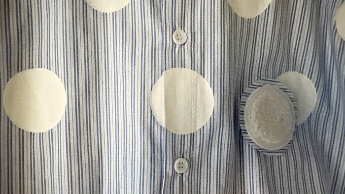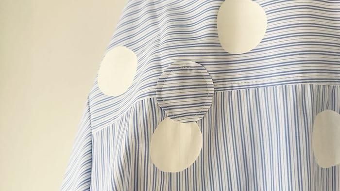 ワッペンをつけなくても、こうして同じ生地を丸く切って縫い付けたりもします。これ、ストライプ柄でやるとほんとうにいいアクセントになります。生地の縫い合わせのところにあえて縫い付けます。ストライプの線の方向性のちがうものが接し合うのがいいコントラストになるわけです。